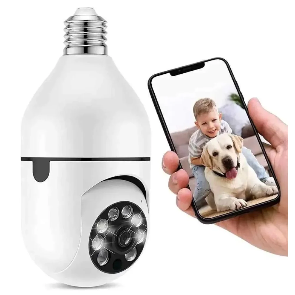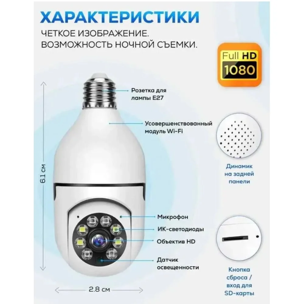 Поворотная Беспроводная Wi-Fi камера лампа может вращаться в горизонтальной и вертикальной плоскости. Горизонтальный 355 ° Вертикальный 90 °. Вы можете контролировать угол обзора камеры через приложение для достижения 360-градусного просмотра без слепых пятен.