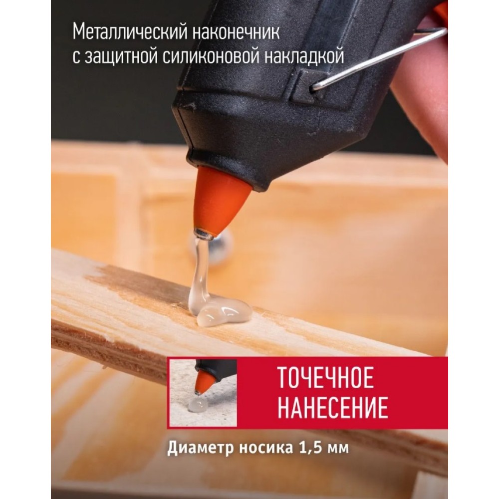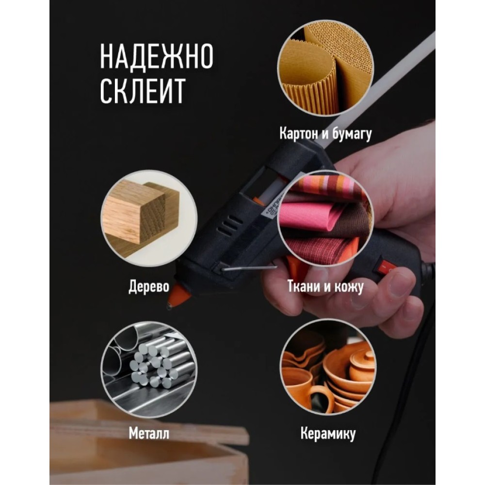 Принцип работы: клеевой термопистолет «заряжается» клеевым полиуретановым стержнем, который под воздействием высокой температуры нагревается, и клей в расплавленном виде подается через носик-сопло.. Термоклеевой пистолет имеет длинный кабель – 1 метр, а также устойчивую складную подставку и индикаторную кнопку включения и выключения на корпусе. Носик клеящего пистолета – металлический, и имеет защитную силиконовую накладку. Специальная форма носика диаметром 1,5 мм позволяет тонко наносить клей, достаточно легкого нажатия на курок. Время разогрева клеевого пистолета для творчества 3-5 минут.